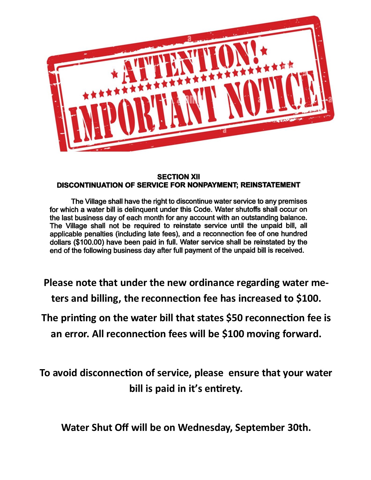 The Village Board has approved a new Ordinance Regarding Water Meters and Billing. There has been a change to the Water Shut Off Procedure. Please note that Water will be shut off the last business day of the month to all accounts with an outstanding balance.